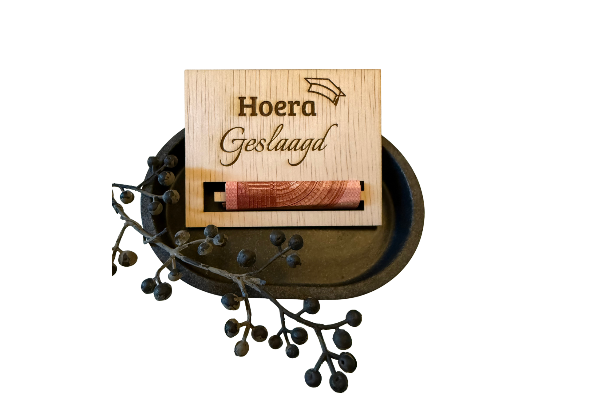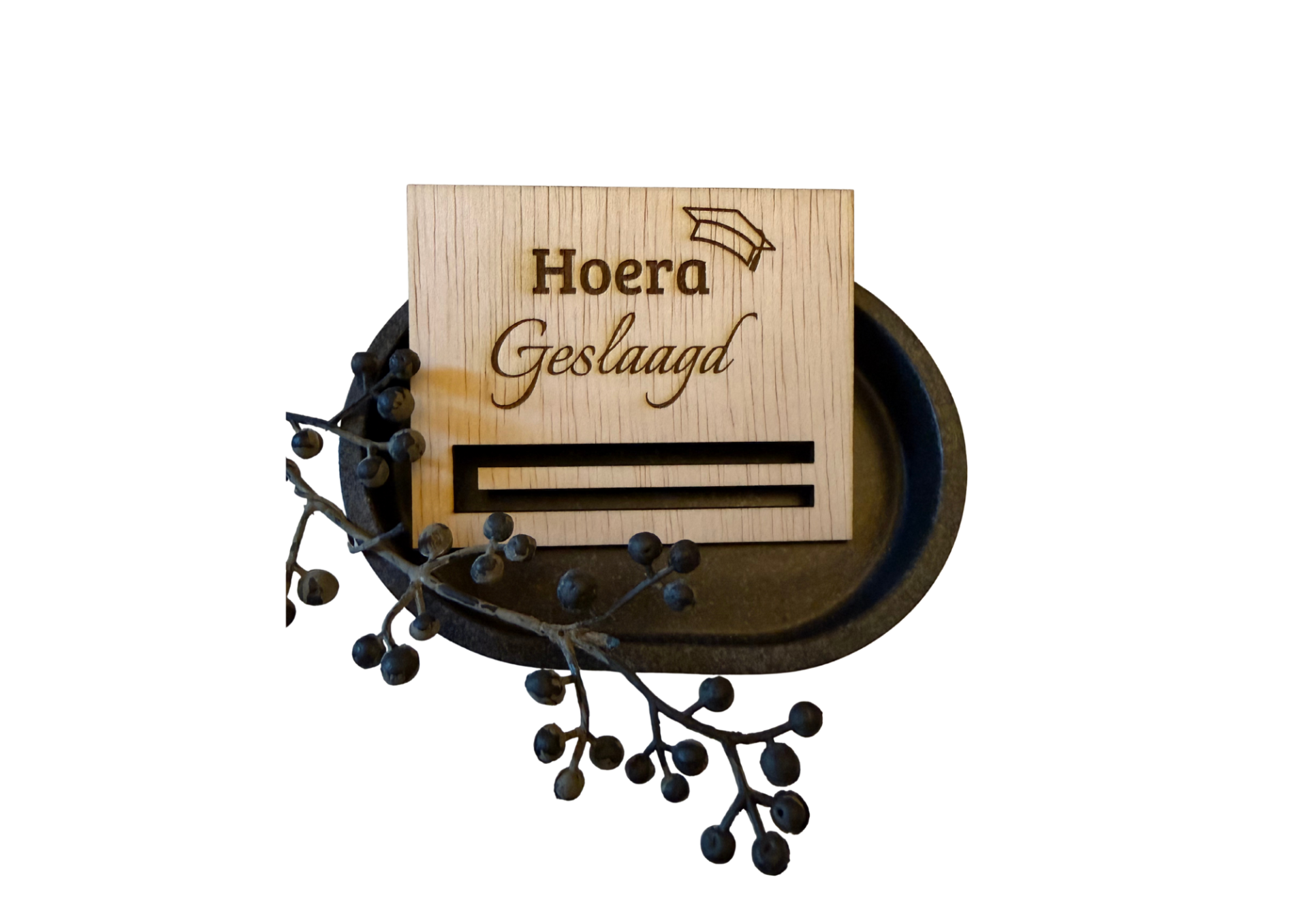 Op een leuke manier geld geven voor het halen van een diploma? Rol het geld om de houder zie foto en stop de kaart in het bijgeleverde doorzichtig zakje met sticker. Zo heb je het leuk ingepakt om weg te geven.